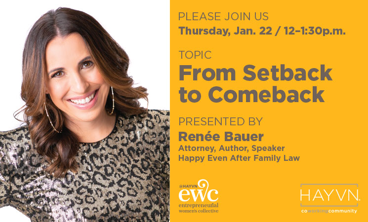 Jan 22 12:00 pm - 1:30 pm Entrepreneurial Women’s Collective (EWC) Luncheon: From Setback to Comeback w/ Renée Bauer $25 – $50
