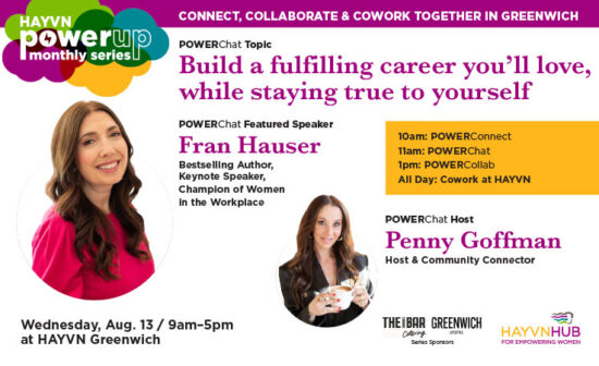 Empowering women leaders and builders through power connections, power chats, power collaborations & coworking. With host Penny Goffman, featuring Fran Hauser, Bestselling Author, Keynote Speaker, Champion of Women in the Workplace. One easy sign up, all activities! Sponsors: Greenwich Lifestyle Magazine & The Granola Bar.